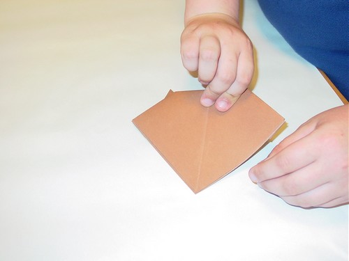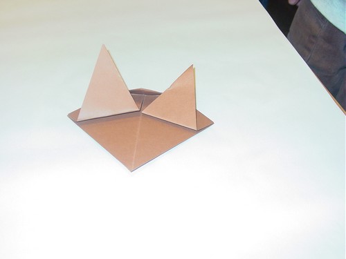 Rabattre la pointe située entre les oreilles sur elle-même, selon la diagonale du petit carré.