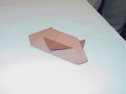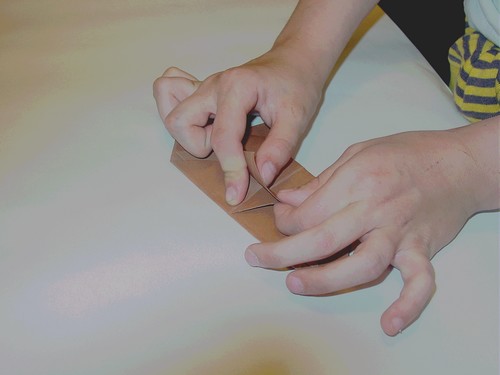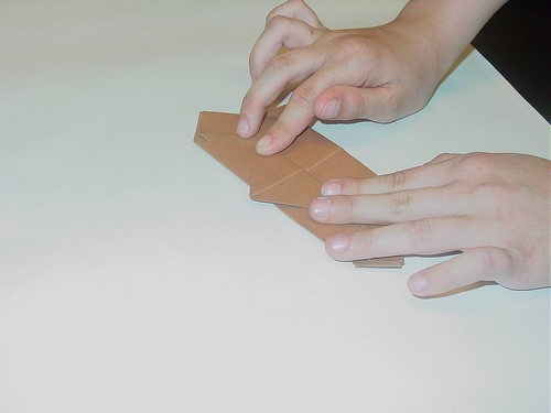 Plier les deux pointes vers le bas et en même temps de façon que celle du dessus dépasse légèrement et que la pointe cachée coïncide avec le bord du bas.