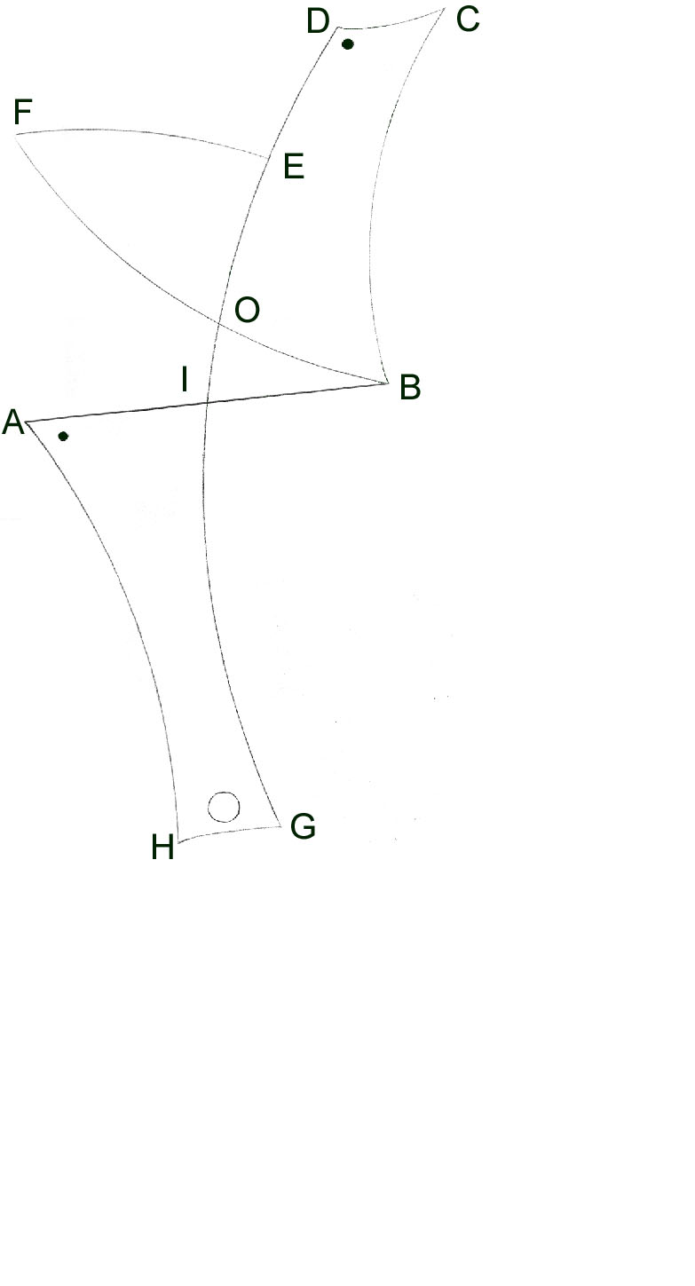 Nous avons nommé les points A, B, C, D, E, F, G, H, I et O et les points " ' "de la façon suivante : A est l'extrémité gauche du segment situé au centre de la figure B est l'extrémité droite de ce même segment I est le milieu du segment [AB] C est le point situé le plus en haut à droite de la figure D est situé immédiatement à gauche de C F est le point situé le plus en haut à gauche de la figure, au dessus de A (c'est le bout de " l'aile ") O est à l'intersection des arcs de cercles FB et ID G est le point situé le plus en bas à droite de la figure dans le prolongement de l'arc ID H est situé à gauche de G, c'est le point le plus en bas à gauche de la figure.  |
